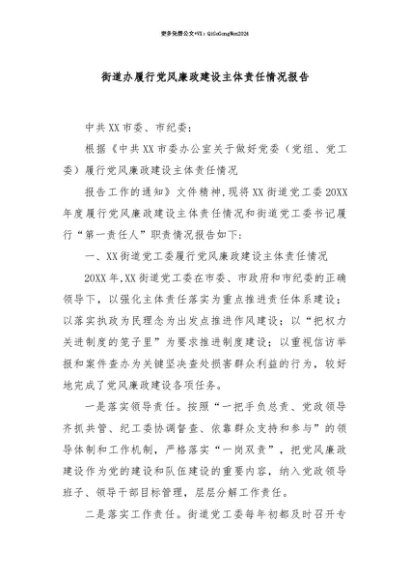 【七哥公文】2025年:【七哥公文】街道办履行党风廉政建设主体责任情况报告+更多免费公文+VX:QiGeGongWen2024+更多免费公文+VX:QiGeGongWen2024