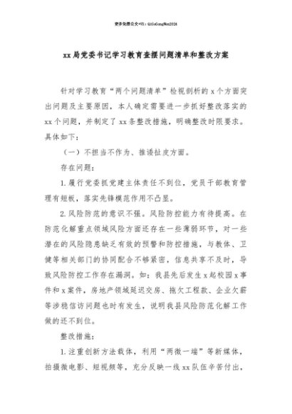 【七哥公文】2025年:【七哥公文】xx局党委书记学习教育查摆问题清单和整改方案+更多免费公文+VX:QiGeGongWen2024+更多免费公文+VX:QiGeGongWen2024