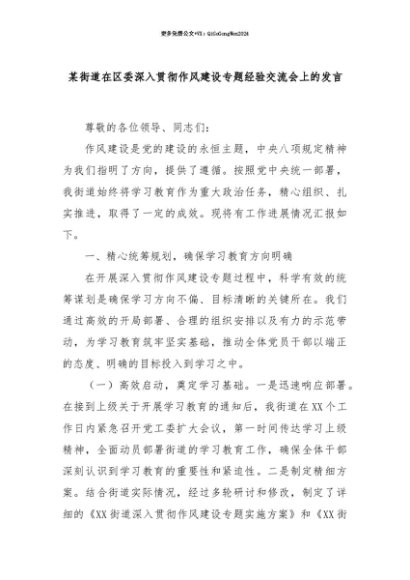 【七哥公文】2025年:【七哥公文】某街道在区委深入贯彻作风建设专题经验交流会上的发言+更多免费公文+VX:QiGeGongWen2024+更多免费公文+VX:QiGeGongWen2024