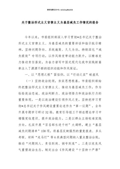 【七哥公文】2025年:【七哥公文】关于整治形式主义官僚主义为基层减负工作情况的报告+更多免费公文+VX:QiGeGongWen2024+更多免费公文+VX:QiGeGongWen2024