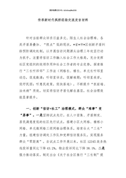 【七哥公文】2025年:【七哥公文】传承新时代枫桥经验交流发言材料+更多免费公文+VX:QiGeGongWen2024+更多免费公文+VX:QiGeGongWen2024