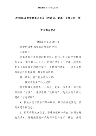 【七哥公文】2025年:【七哥公文】在2025届校友联络员会议上的讲话:青春不负凌云志,校友长牵母校心+更多免费公文+VX:QiGeGongWen2024+更多免费公文+VX:QiGeGongWen2024