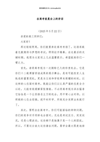 【七哥公文】2025年:【七哥公文】在高考前晨会上的讲话+更多免费公文+VX:QiGeGongWen2024+更多免费公文+VX:QiGeGongWen2024