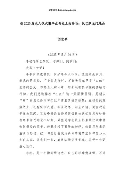 【七哥公文】2025年:【七哥公文】在2025届成人仪式暨毕业典礼上的讲话:悦己跃龙门越山阅世界+更多免费公文+VX:QiGeGongWen2024+更多免费公文+VX:QiGeGongWen2024