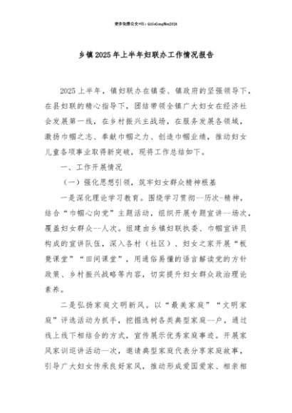 【七哥公文】2025年:【七哥公文】乡镇2025年上半年妇联办工作情况报告+更多免费公文+VX:QiGeGongWen2024+更多免费公文+VX:QiGeGongWen2024