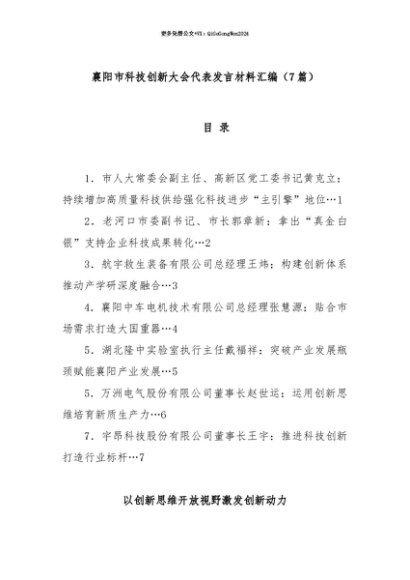【七哥公文】2025年:【七哥公文】(7篇)襄阳市科技创新大会代表发言材料汇编+更多免费公文+VX:QiGeGongWen2024+更多免费公文+VX:QiGeGongWen2024