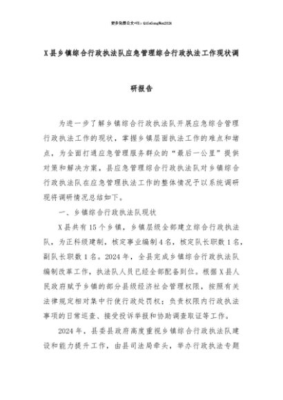 【七哥公文】2025年:【七哥公文】X县乡镇综合行政执法队应急管理综合行政执法工作现状调研报告+更多免费公文+VX:QiGeGongWen2024+更多免费公文+VX:QiGeGongWen2024