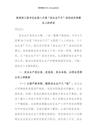 【七哥公文】2025年:【七哥公文】街道党工委书记在深入开展“安全生产月”活动动员部署会上的讲话+更多免费公文+VX:QiGeGongWen2024+更多免费公文+VX:QiGeGongWen2024