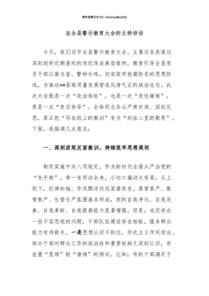 【七哥公文】2025年:【七哥公文】在全县警示教育大会的主持讲话+更多免费公文+VX:QiGeGongWen2024+更多免费公文+VX:QiGeGongWen2024