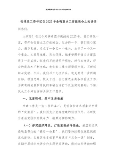 【七哥公文】2025年:【七哥公文】街道党工委书记在2025年全街重点工作推进会上的讲话+更多免费公文+VX:QiGeGongWen2024+更多免费公文+VX:QiGeGongWen2024