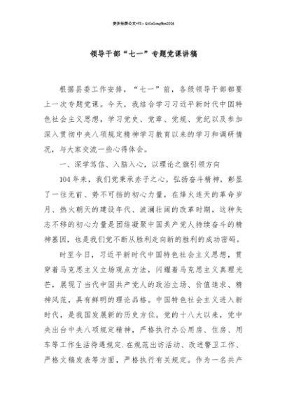 【七哥公文】2025年:【七哥公文】领导干部“七一”专题党课讲稿+更多免费公文+VX:QiGeGongWen2024+更多免费公文+VX:QiGeGongWen2024