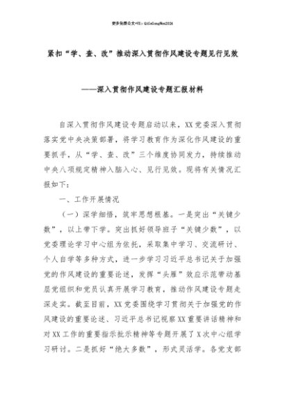 【七哥公文】2025年:【七哥公文】紧扣“学、查、改”推动深入贯彻作风建设专题见行见效——深入贯彻作风建设专题汇报材料+更多免费公文+VX:QiGeGongWen2024+更多免费公文+VX:QiGeGongWen2024