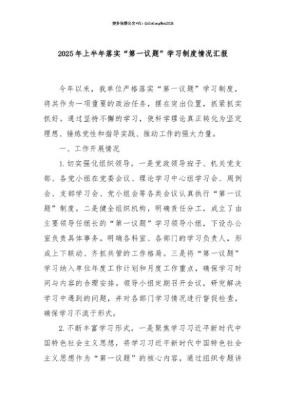 【七哥公文】2025年:【七哥公文】2025年上半年落实“第一议题”学习制度情况汇报+更多免费公文+VX:QiGeGongWen2024+更多免费公文+VX:QiGeGongWen2024