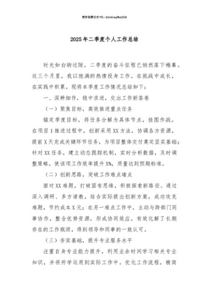 【七哥公文】2025年:【七哥公文】2025年二季度个人工作总结+更多免费公文+VX:QiGeGongWen2024+更多免费公文+VX:QiGeGongWen2024