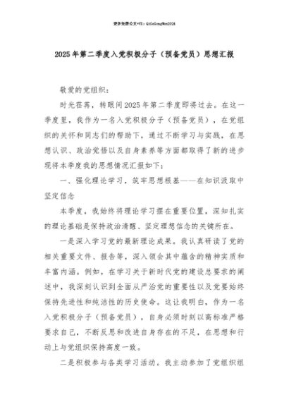 【七哥公文】2025年:【七哥公文】2025年第二季度入党积极分子(预备党员)思想汇报+更多免费公文+VX:QiGeGongWen2024+更多免费公文+VX:QiGeGongWen2024