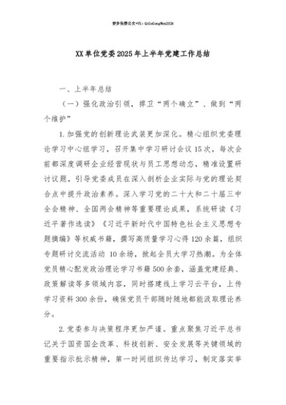 【七哥公文】2025年:【七哥公文】XX单位党委2025年上半年党建工作总结+更多免费公文+VX:QiGeGongWen2024+更多免费公文+VX:QiGeGongWen2024