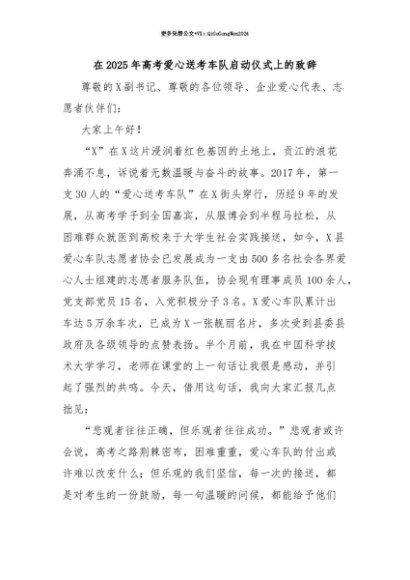 【七哥公文】2025年:【七哥公文】在2025年高考爱心送考车队启动仪式上的致辞+更多免费公文+VX:QiGeGongWen2024+更多免费公文+VX:QiGeGongWen2024