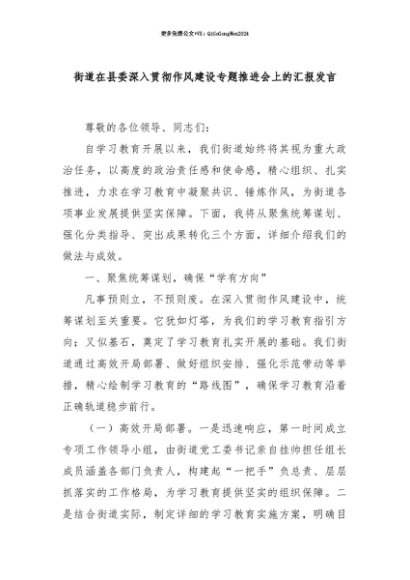 【七哥公文】2025年:【七哥公文】街道在县委深入贯彻作风建设专题推进会上的汇报发言+更多免费公文+VX:QiGeGongWen2024+更多免费公文+VX:QiGeGongWen2024