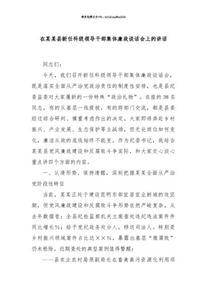 【七哥公文】2025年:【七哥公文】在某某县新任科级领导干部集体廉政谈话会上的讲话+更多免费公文+VX:QiGeGongWen2024+更多免费公文+VX:QiGeGongWen2024