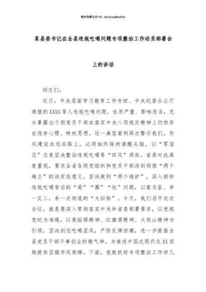 【七哥公文】2025年:【七哥公文】某县委书记在全县违规吃喝问题专项整治工作动员部署会上的讲话+更多免费公文+VX:QiGeGongWen2024+更多免费公文+VX:QiGeGongWen2024