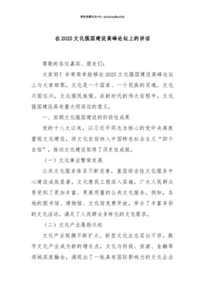 【七哥公文】2025年:【七哥公文】在2025文化强国建设高峰论坛上的讲话+更多免费公文+VX:QiGeGongWen2024+更多免费公文+VX:QiGeGongWen2024