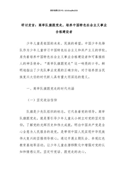 【七哥公文】2025年:【七哥公文】研讨发言:高举队旗跟党走,培养中国特色社会主义事业合格建设者+更多免费公文+VX:QiGeGongWen2024+更多免费公文+VX:QiGeGongWen2024