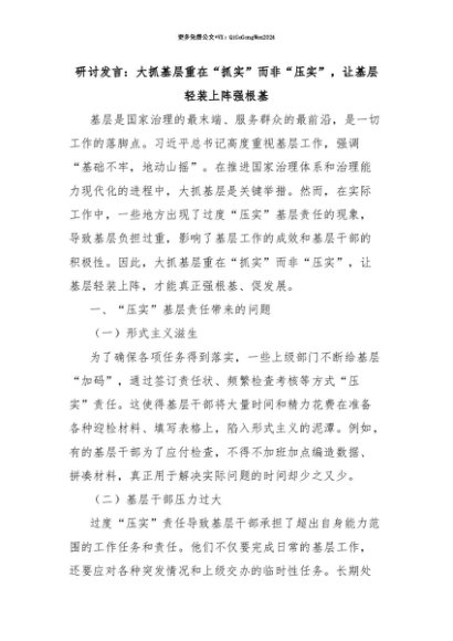 【七哥公文】2025年:【七哥公文】研讨发言:大抓基层重在“抓实”而非“压实”,让基层轻装上阵强根基+更多免费公文+VX:QiGeGongWen2024+更多免费公文+VX:QiGeGongWen2024
