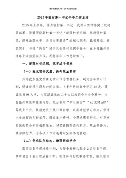 【七哥公文】2025年:【七哥公文】16.2025年驻村第一书记半年工作总结+更多免费公文+VX:QiGeGongWen2024+更多免费公文+VX:QiGeGongWen2024