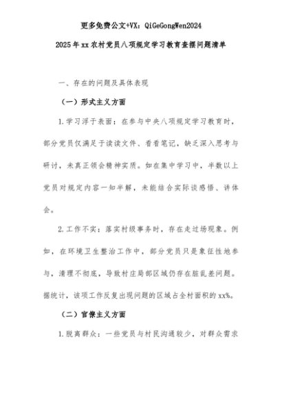 【七哥公文】2025年:2025年xx农村党员八项规定学习教育查摆问题清单+更多免费公文+VX:QiGeGongWen2024+更多免费公文+VX:QiGeGongWen2024