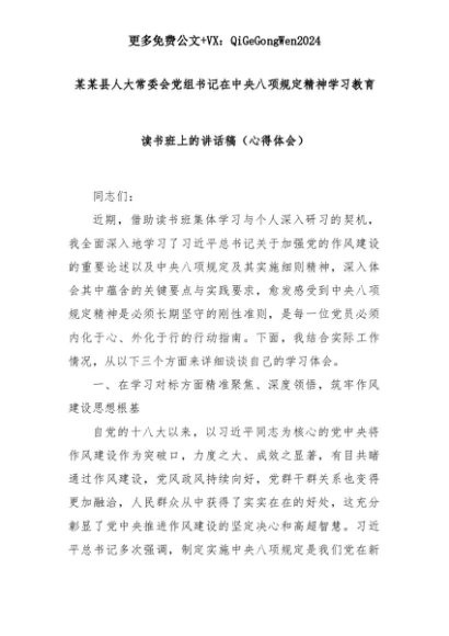 【七哥公文】2025年:某某县人大常委会党组书记在中央八项规定精神学习教育读书班上的讲话稿(心得体会)+更多免费公文+VX:QiGeGongWen2024+更多免费公文+VX:QiGeGongWen2024