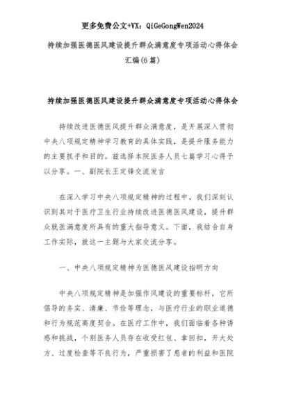 【七哥公文】2025年:(6篇)持续加强医德医风建设提升群众满意度专项活动心得体会汇编+更多免费公文+VX:QiGeGongWen2024+更多免费公文+VX:QiGeGongWen2024