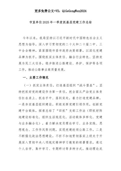 【七哥公文】2025年:市直单位2025年一季度抓基层党建工作总结+更多免费公文+VX:QiGeGongWen2024+更多免费公文+VX:QiGeGongWen2024