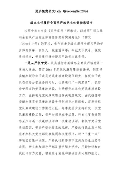 【七哥公文】2025年:编办主任履行全面从严治党主体责任承诺书+更多免费公文+VX:QiGeGongWen2024+更多免费公文+VX:QiGeGongWen2024