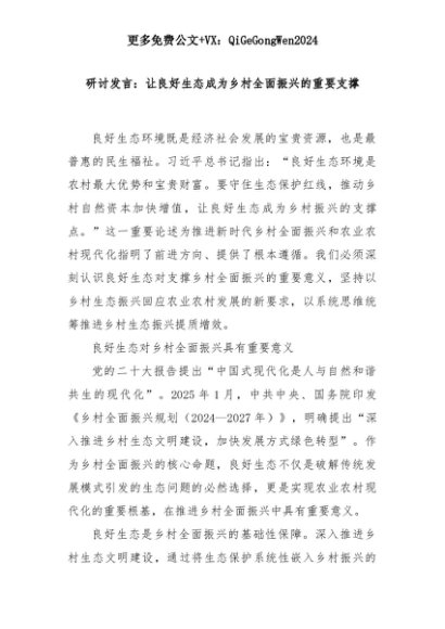 【七哥公文】2025年:研讨发言:让良好生态成为乡村全面振兴的重要支撑+更多免费公文+VX:QiGeGongWen2024+更多免费公文+VX:QiGeGongWen2024