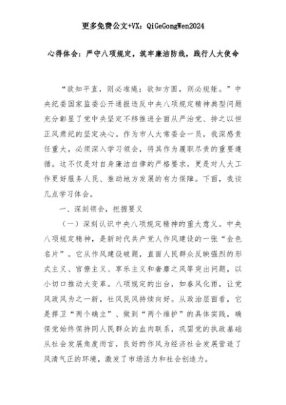 【七哥公文】2025年:心得体会:严守八项规定,筑牢廉洁防线,践行人大使命+更多免费公文+VX:QiGeGongWen2024+更多免费公文+VX:QiGeGongWen2024
