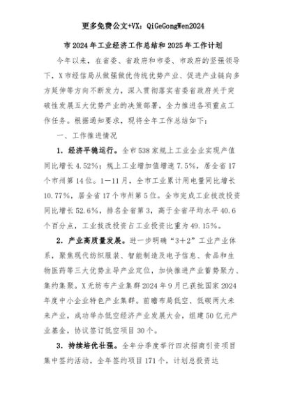 【七哥公文】2025年:市2024年工业经济工作总结和2025年工作计划+更多免费公文+VX:QiGeGongWen2024+更多免费公文+VX:QiGeGongWen2024