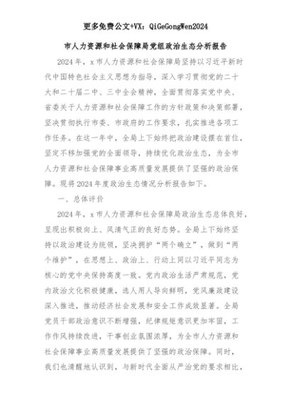 【七哥公文】2025年:市人力资源和社会保障局党组政治生态分析报告+更多免费公文+VX:QiGeGongWen2024+更多免费公文+VX:QiGeGongWen2024