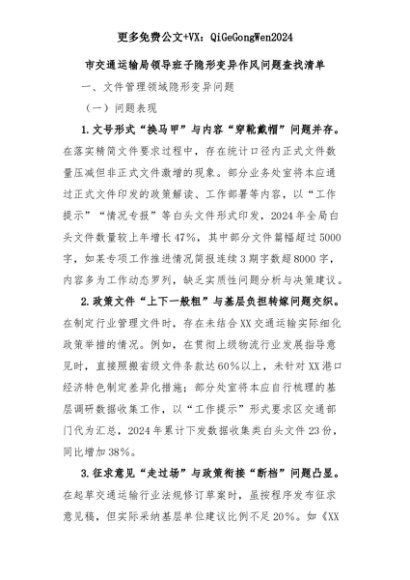 【七哥公文】2025年:市交通运输局领导班子隐形变异作风问题查找清单+更多免费公文+VX:QiGeGongWen2024+更多免费公文+VX:QiGeGongWen2024