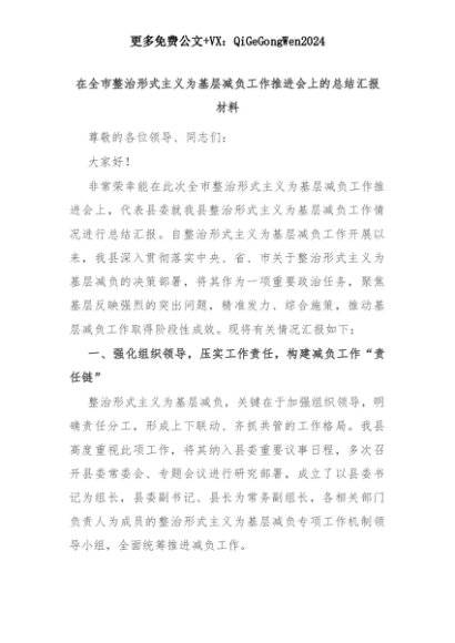 【七哥公文】2025年:在全市整治形式主义为基层减负工作推进会上的总结汇报材料+更多免费公文+VX:QiGeGongWen2024+更多免费公文+VX:QiGeGongWen2024