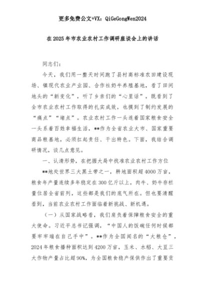 【七哥公文】2025年:在2025年市农业农村工作调研座谈会上的讲话+更多免费公文+VX:QiGeGongWen2024+更多免费公文+VX:QiGeGongWen2024