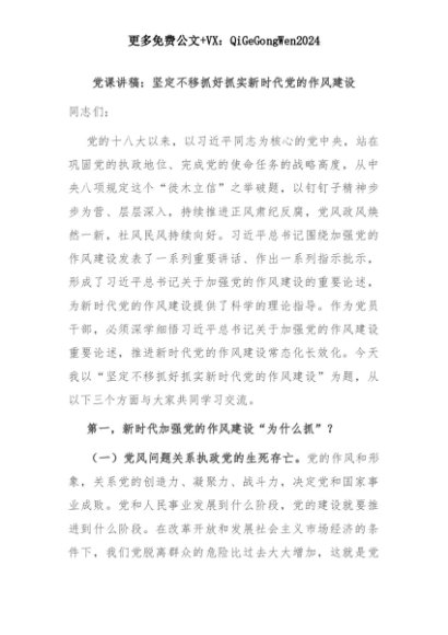 【七哥公文】2025年:党课讲稿:坚定不移抓好抓实新时代党的作风建设+更多免费公文+VX:QiGeGongWen2024+更多免费公文+VX:QiGeGongWen2024