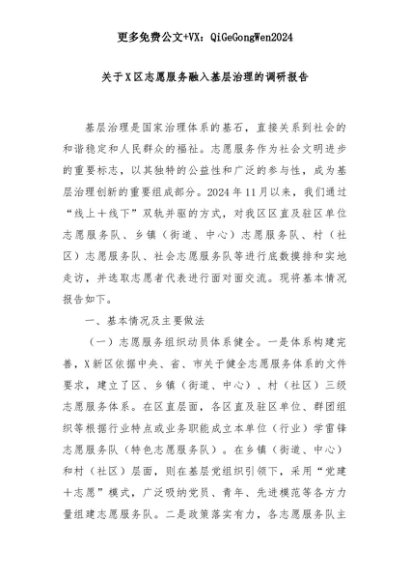 【七哥公文】2025年:关于X区志愿服务融入基层治理的调研报告+更多免费公文+VX:QiGeGongWen2024+更多免费公文+VX:QiGeGongWen2024
