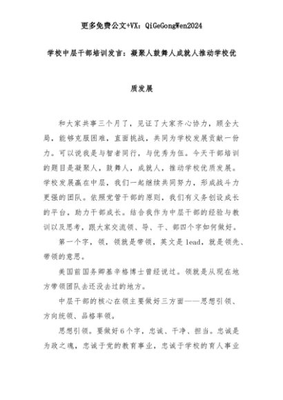 【七哥公文】2025年:学校中层干部培训发言:凝聚人鼓舞人成就人推动学校优质发展+更多免费公文+VX:QiGeGongWen2024+更多免费公文+VX:QiGeGongWen2024