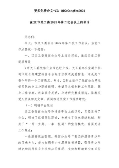 【七哥公文】2025年:在XX市关工委2025年第二次会议上的讲话+更多免费公文+VX:QiGeGongWen2024+更多免费公文+VX:QiGeGongWen2024