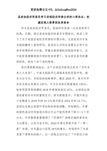 【七哥公文】2025年:县政协经济界委员学习宏观经济形势分析的心得体会:把握宏观大势勇担改革使命+更多免费公文+VX:QiGeGongWen2024+更多免费公文+VX:QiGeGongWen2024
