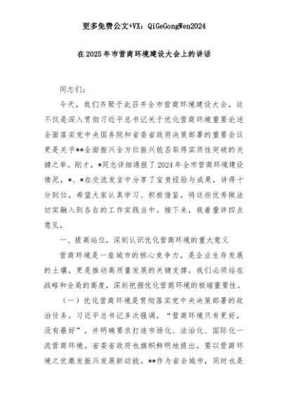 【七哥公文】2025年:在2025年市营商环境建设大会上的讲话+更多免费公文+VX:QiGeGongWen2024+更多免费公文+VX:QiGeGongWen2024