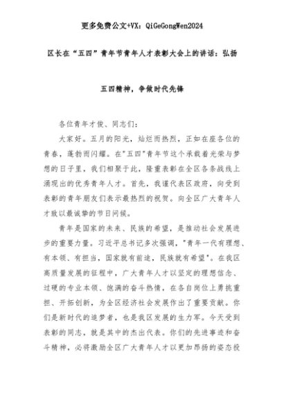 【七哥公文】2025年:区长在“五四”青年节青年人才表彰大会上的讲话:弘扬五四精神,争做时代先锋+更多免费公文+VX:QiGeGongWen2024+更多免费公文+VX:QiGeGongWen2024