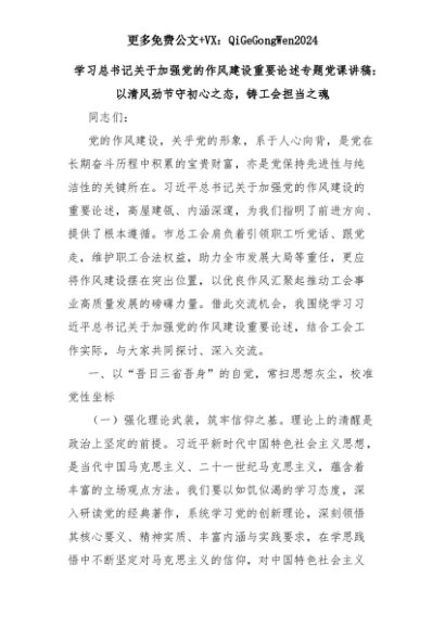 【七哥公文】2025年:学习总书记关于加强党的作风建设重要论述专题党课讲稿:以清风劲节守初心之态,铸工会担当之魂+更多免费公文+VX:QiGeGongWen2024+更多免费公文+VX:QiGeGongWen2024