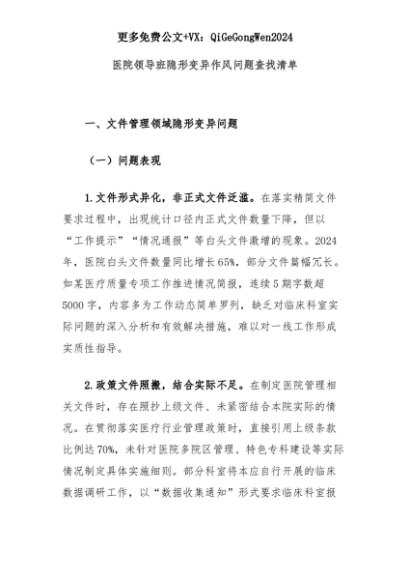 【七哥公文】2025年:医院领导班隐形变异作风问题查找清单+更多免费公文+VX:QiGeGongWen2024+更多免费公文+VX:QiGeGongWen2024