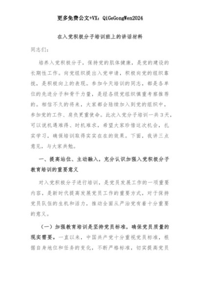 【七哥公文】2025年:在入党积极分子培训班上的讲话材料+更多免费公文+VX:QiGeGongWen2024+更多免费公文+VX:QiGeGongWen2024